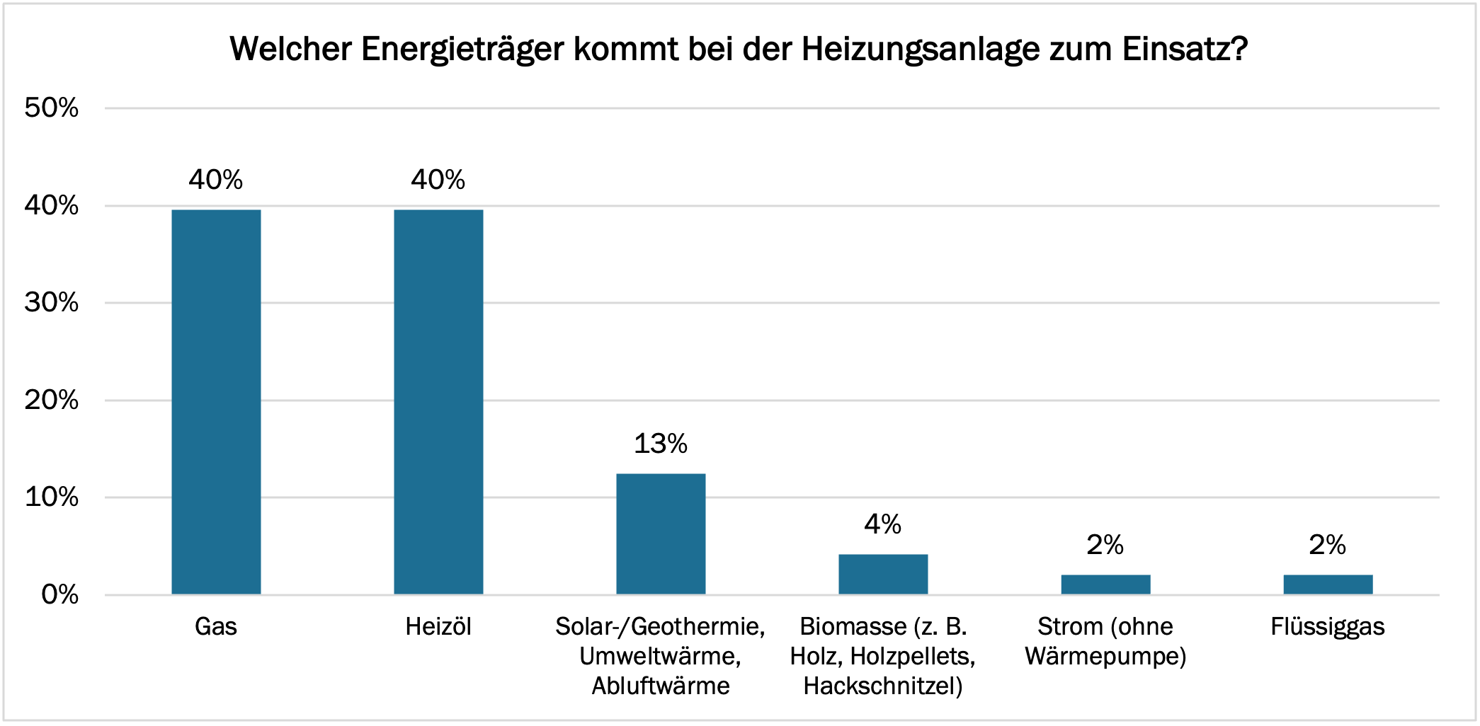 Alle Teilnehmenden verfügen über mindestens eine eigene dezentrale Heizungsanlage. Den größten Anteil stellen Öl- und Gasheizungen dar, die zusammen rund 80 % der Systeme ausmachen (ohne Berücksichtigung sekundärer Heizungen). Erdgas- und Ölheizungen sind dabei mit jeweils etwa 40 % gleich stark vertreten, was auf die weite Verbreitung leitungsgebundener Erdgasheizungen hinweist. Weitere 2 % entfallen auf Flüssiggas. Heizungsanlagen auf Basis erneuerbarer Energien haben einen Anteil von insgesamt 17 %. Davon nutzen 4 % Biomasse (z. B. Pellets oder Holzhackschnitzel), während 13 % auf Umweltwärme, Solarthermie oder oberflächennahe Geothermie zurückgehen.