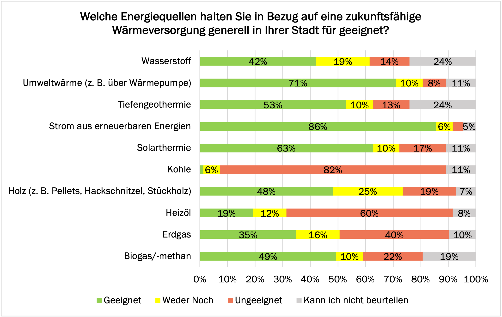 Abbildung 44: Frage – Welche Energiequellen halten Sie in Bezug auf eine zukunftsfähige Wärmeversorgung generell in Ihrer Stadt für geeignet?